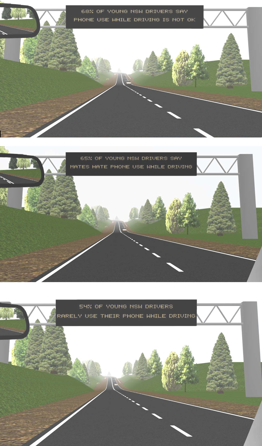 Three social norms messages were developed by the authors using data from a previous study (Gauld & Reeves, 2023). They focused on either descriptive norm, subjective norm, or injunctive norm and were presented on participants’ computer or smartphone screen as a static billboard image taken from a simulated driving environment (Figure 1). Each message was carefully developed with the key factors that are known to enhance the effectiveness of social norms messages. Specifically, they each included a strong referent group relevant to the target audience (i.e., young NSW drivers), were written in plain language appropriate for the target audience, and included a believable statistic drawn from a previous study (Gauld & Reeves, 2023). To ensure credibility, participants were told the source of the statistic before the message was presented. For example, the following text was included before presenting the injunctive norm message: