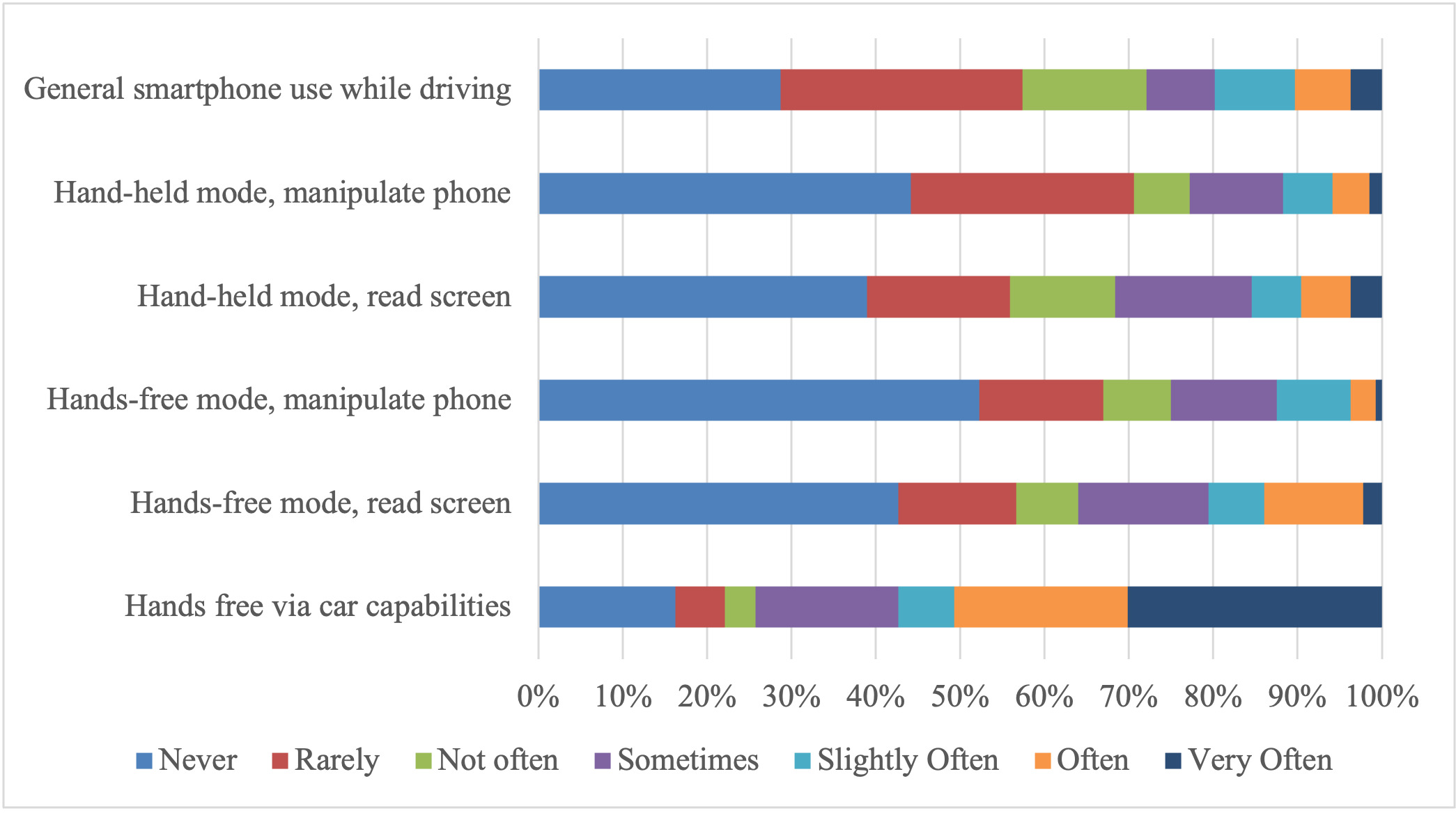 As shown in Table 1, 72 percent of participants reported using their smartphone while driving in a general manner in the past week. When asked about specific smartphone use while driving behaviours, 62 percent of participants reported reading the smartphone screen in hands-held mode and 56 percent of participants reported physically manipulating their smartphone (e.g., touch or hold) to some extent while driving (Figure 2).