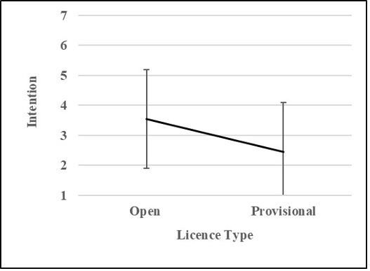 To address the first hypothesis, that social norms messages will be more persuasive for provisional licence holders than for open licence holders, a series of two-way ANOVAs were conducted with message type and licence type for each of the dependent variables (i.e., message acceptance, message rejection, and third person effect). As shown in Figure 3, and providing some support for the first hypothesis, there was a significant licence type main effect for intention F(1, 130)=13.56, p < .001, ŋp2 = .09. Specifically, open licence holders (M = 3.55, SD = 1.79) had a significantly higher intention than provisional licence holders (M = 2.44, SD = 1.65) to use their smartphone while driving in the next week, regardless of the message type.