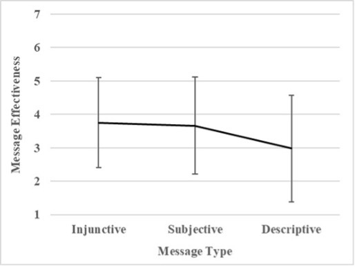 Figure 4 shows there was a significant message main effect, F(2, 130)=4.64, p = .011, ŋp2 = .07 for message effectiveness. Using the Bonferroni adjustment, a p-value of less than .02 (rounded to two decimal places) was applied to the post-hoc tests which found no significant differences between the pairs of messages. Inspection of Figure 4, however, suggests that both the injunctive norm message (M =3.75, SD = 1.35) and the subjective norm message (M = 3.66, SD = 1.45) were more effective than the descriptive norm message (M = 2.98, SD = 1.59).