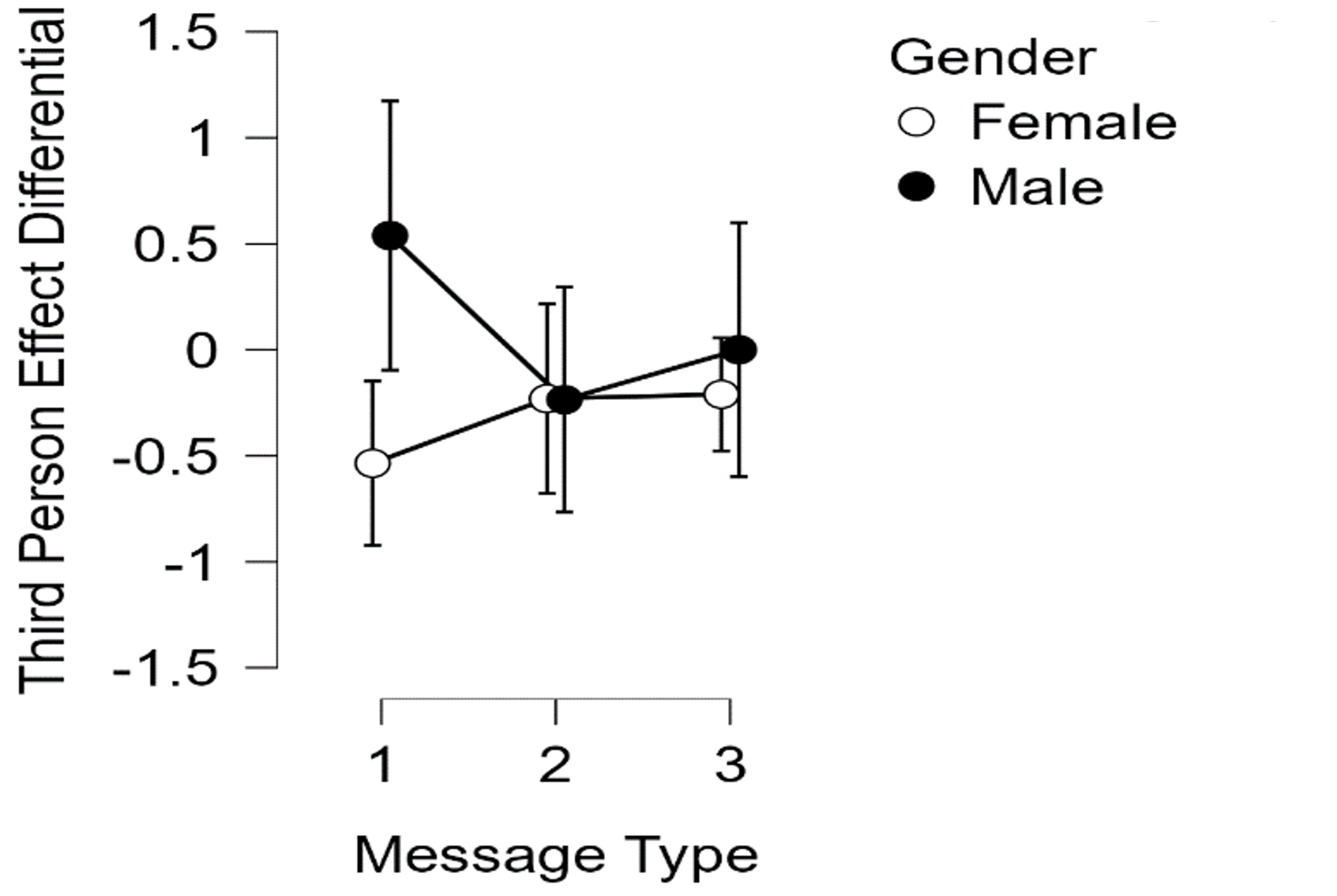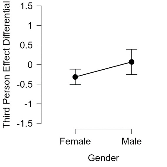 As shown in Figure 6, a significant gender main effect was found for third person effect F(1, 130)=5.45, p = .021, ŋp2 = .04. Specifically, males (M = 0.07, SD = 1.07) were significantly more likely than females (M = - 0.36, SD = 0.96) to report the third person effect, regardless of message. The same message main effect was found as for the analyses with licence type.