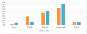 Health professionals most frequently reported they addressed the transport needs of their clients ‘occasionally’ (1-2 times per year, n=57, 45.2%) or ‘monthly’ (n=44, 34.9%). Only 16 participants reported providing these services more frequently (weekly: n=12, 9.50%; daily: n=5, 4.0%). Eight participants (6.3%) reported rarely addressing car seating and transport needs for children with disabilities or medical conditions. When examining repeat participants between the 2020 and 2023 time-points there was a modest increase in health professionals addressing their clients’ transport needs daily and monthly, but a decrease in those doing so weekly (Figure 1).