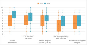 Despite these positive developments, the study also highlights areas where further improvements are needed. Although reports of some challenges have substantially decreased (e.g., navigating documentation processes, securing funding for prescribed equipment, lack of appropriate training and professional support), other challenges persist. Notably, an increase in the difficulty of understanding vehicle requirements for restraints and seating, as well as challenges with height and weight restrictions. Further efforts to increase health professionals’ knowledge regarding these requirements are needed to address this barrier in clinical practice. The development of future educational resources providing health professionals with more information about different vehicle types, as well as height, weight, or size restrictions of products would improve efficiency and efficacy in the prescription of restraints and seating for children with disabilities and medical conditions.